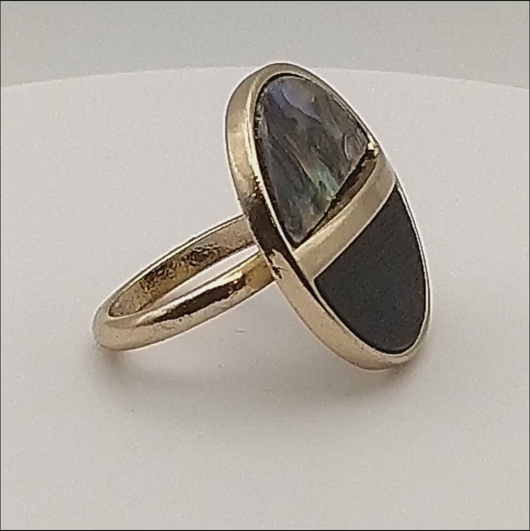 Make a statement with this unique gold-toned ring featuring a stunning combination of abalone shell and black enamel inlay. Crafted from non-precious metals, this piece showcases a beautiful contrast of colors and textures, highlighted by the iridescent shimmer of the abalone.